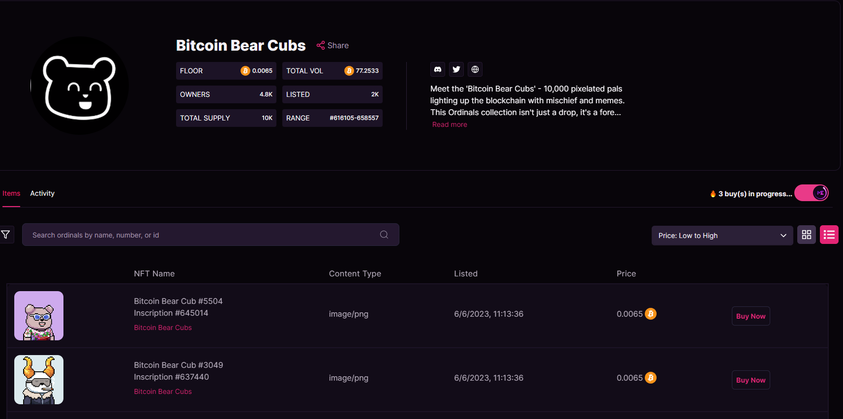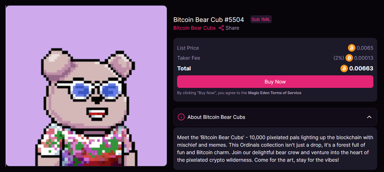 now we are exploring the **bitcoin bear cubs collection,** we can see general information about it.