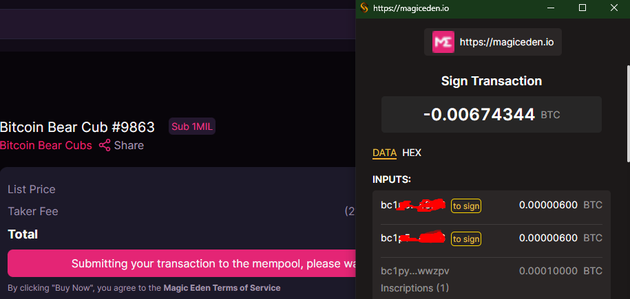 now you will need to sign the transaction on your unisat wallet, and then expect mempool to process your tx. you will see your new NFT in your wallet after some minutes <mark style="color:red;">**(be patient)**</mark>